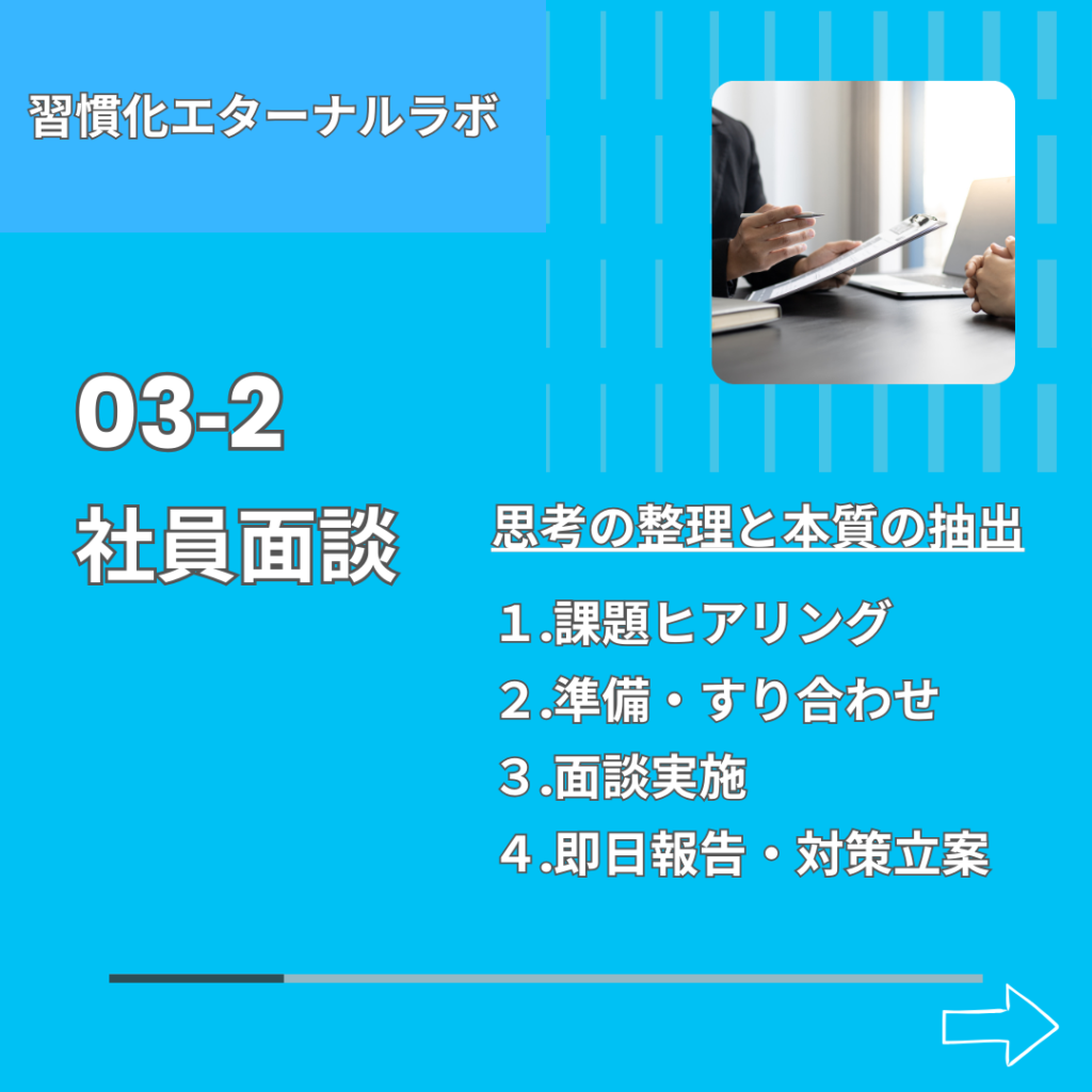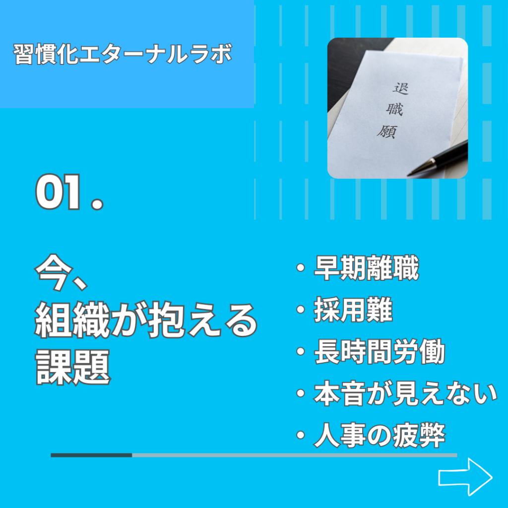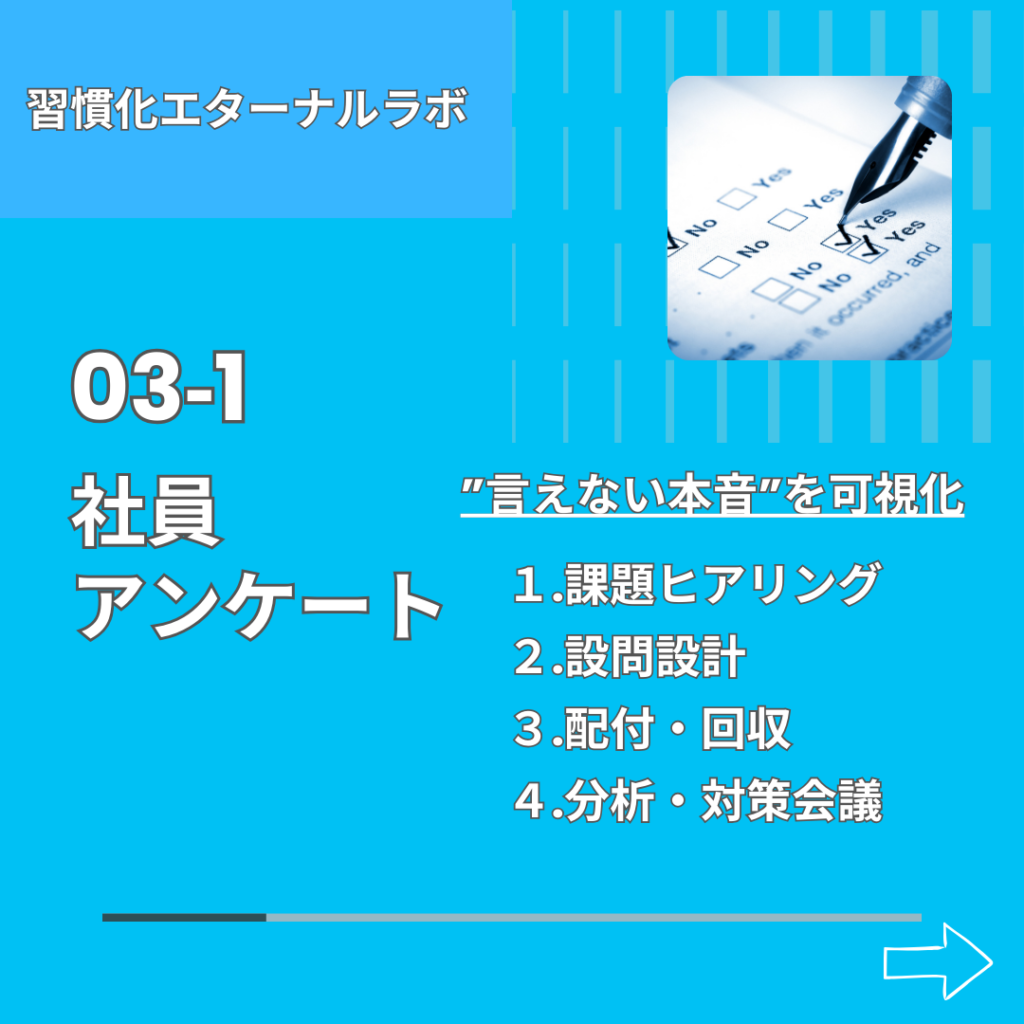 社内には、異動や転勤、給料やボーナス、評価や昇進などいろんな要素が複雑に絡み合っています。だからこそ上司や人事に言えない本音もあり、問題の本質が浮き彫りになりにくい側面があるわけです。その結果、早期離職や人間関係の問題、長時間労働やメンタル不調、パワハラ、セクハラ、いじめにつながる。それを何とか防ぎたい、そんな想いで3-1、3-2、3-3のメニューは構築されています。