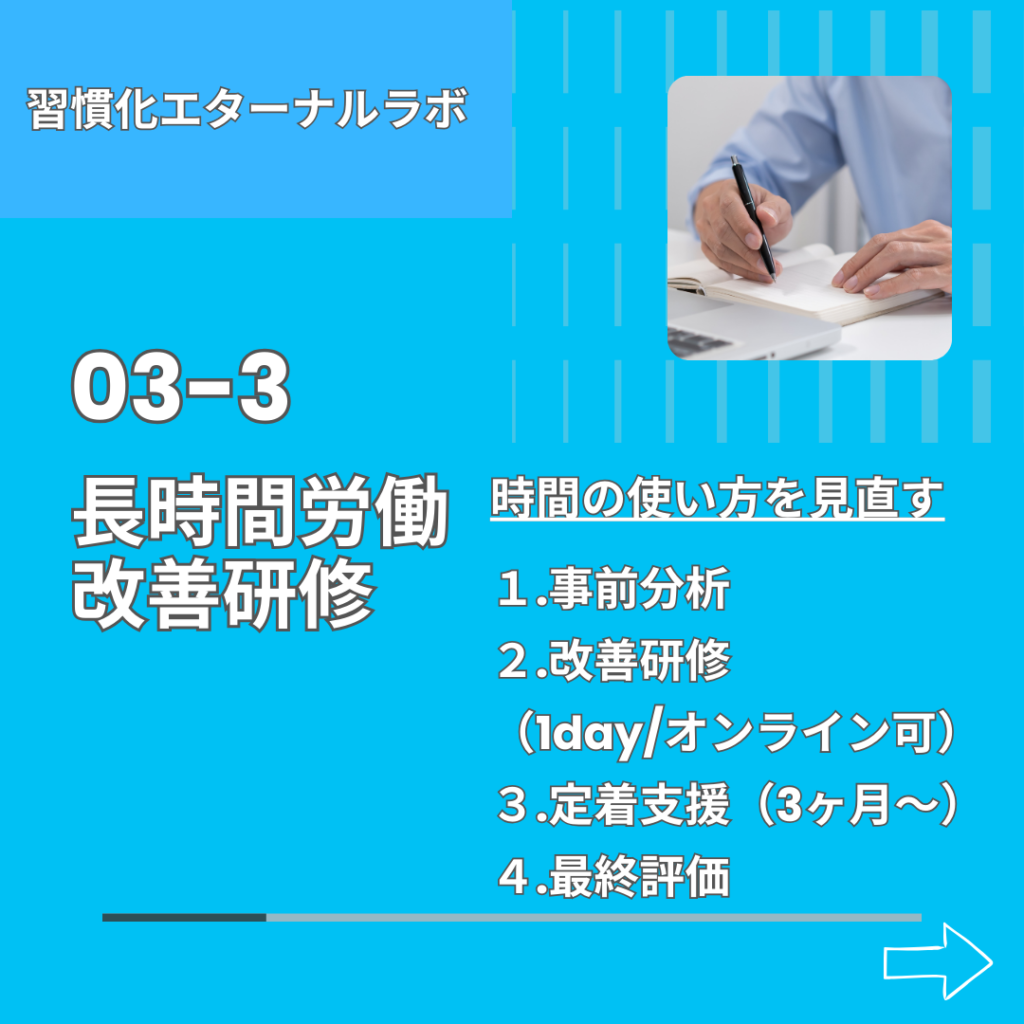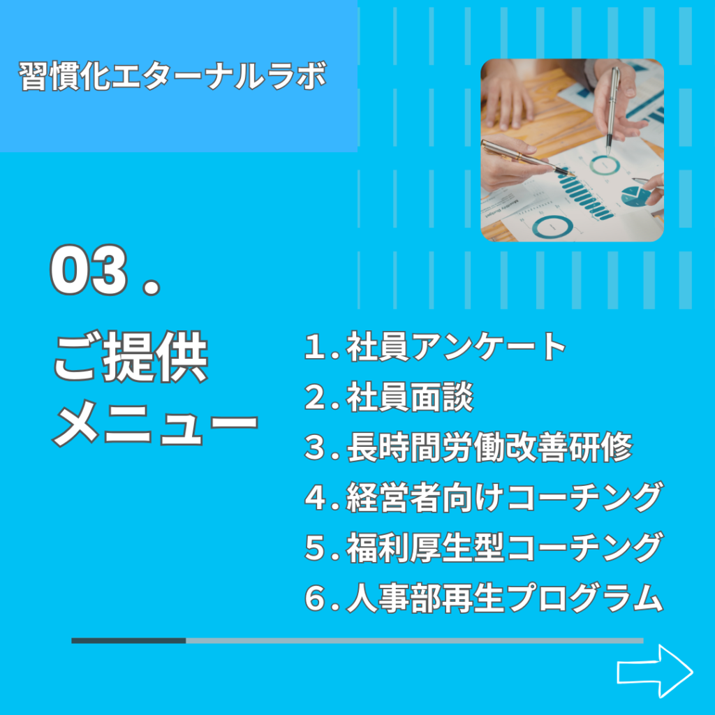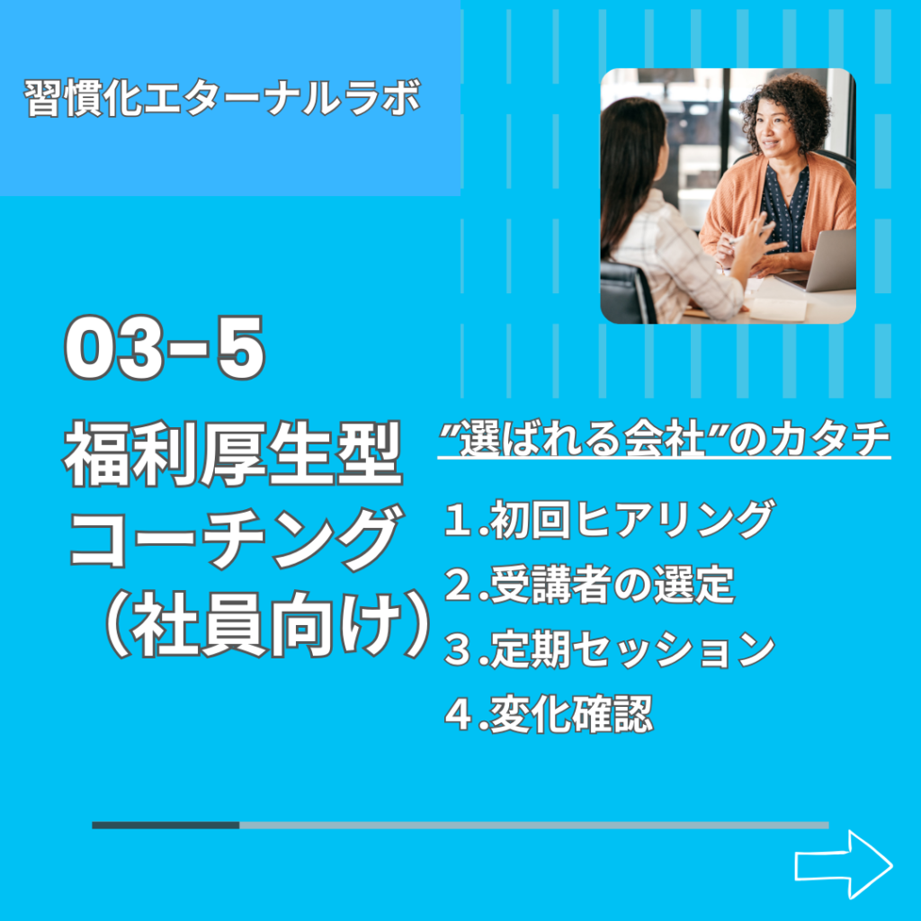 3-5の福利厚生型習慣化コーチング、これはとある経営者さんからの要望がきっかけでした。その会社には体重100㎏以上ある大柄の方がいて「ヤセること」を目標にしているので、何とか「習慣化」で助けてあげて欲しいとのことで今度個別にお話をすることになっています。他社との差別化にお悩みの企業様に、ぜひ福利厚生の一環としてオススメしたいメニューです。
