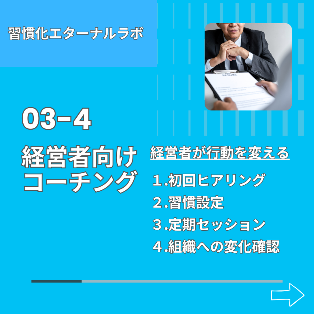 3-4の経営者向けコーチングは、これらの社内の問題を未然に防ぐとともに、経営者と社員の見えている景色の違いにフォーカスして構築しました。私はどちらの気持ちも理解できるので、社員からの見え方を適切に代弁しながら、第三者として客観的にストレートに経営者さんにお伝えすることができる。ぜひうまく使っていただきたいなと思います。