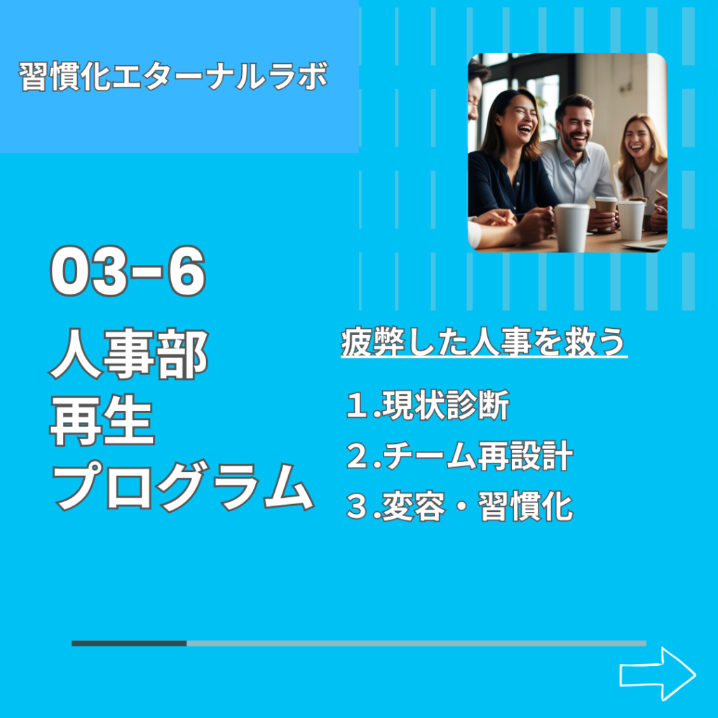 最後の3-6のメニュー、これは実際に人事支援に入った会社さんからのリクエストを形にしたものです。人事は人事で、日々いろんな我慢を強いられます。例えば組織改編や異動、給料や社員の問題は限られたメンバーだけの機密事項なので、同僚や同期であっても気軽に相談できるものではありません。そんな中でも、会社のために、社員のためにと常に誠実に向き合っている人事担当者のキャリアアップにもなり、「安心安全の場を作りたい」そんな願いも詰まっています。
