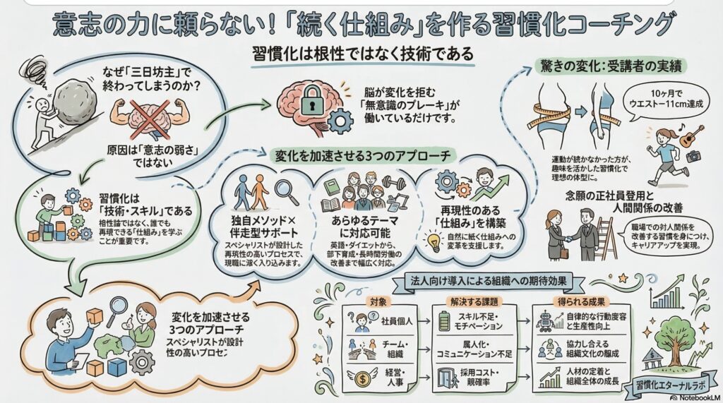 私が「習慣化」を軸にしたビジネスを始めようと思って、早3年が経過しました。その間、習慣化に関する専門書を中心に知識を深め研究し、また実戦での仮説・検証・トライ&エラーを繰り返してきたつもりです。学べば学ぶほど幅広くまた奥が深くて、やはり私にとって一生をかけて研究していくテーマだなと感じています。