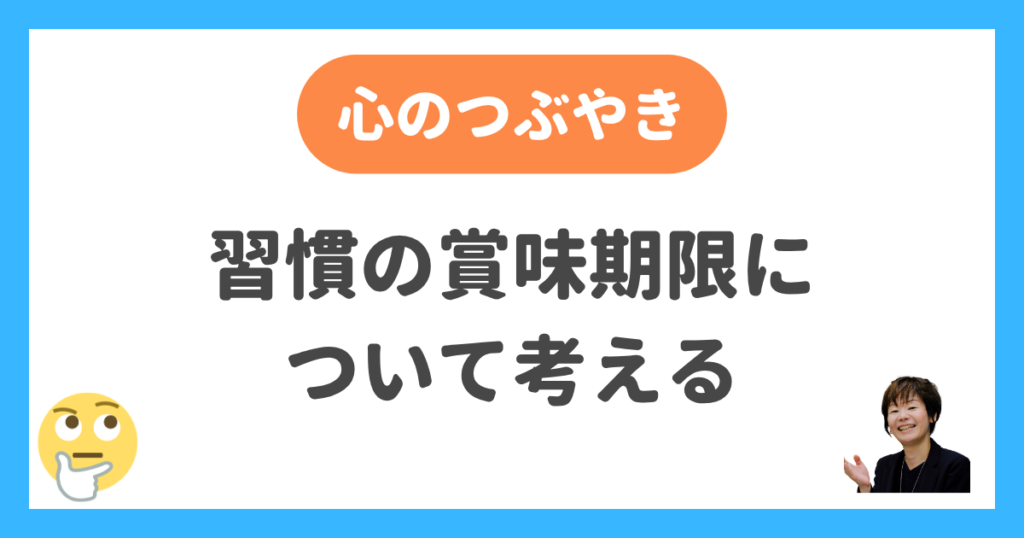 賞味期限というのは通常食品などに対して「おいしく食べられる期限」を指す言葉なので、「習慣の賞味期限」という日本語は正しくないのですが、ここでは「今の自分にとって役に立っている状態を過ぎてしまった習慣」という意味で使っています。