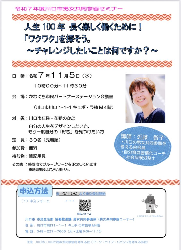 このたび、川口男女共同参画イベントでセミナー講師を務めることになりました。