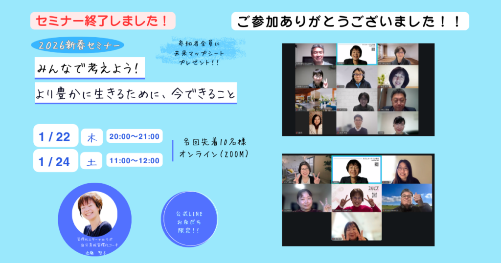 そして今年は「より豊かに生きるために、今できること」。このテーマにしたのは、確かに去年の「習いごと」もより豊かに生きるための1つの手段ではあるものの、もう少し幅広い領域において1人1人にマッチした手段を見つけてもらえたら…そんな想いがあって、11月に川口市で実施したセミナーを少しバージョンアップして企画したものです。